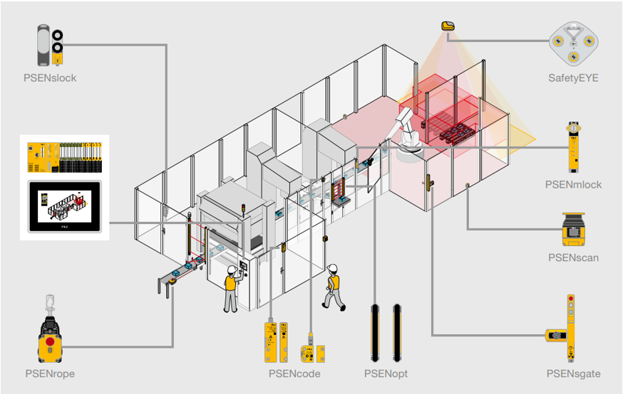 - Controladores configurables (PNOZmulti) para funciones de seguridad y automatización.